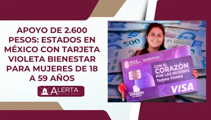 El programa Tarjeta Violeta Bienestar brinda un apoyo económico de 2,600 pesos bimestrales a mujeres de 18 a 59 años en situación de vulnerabilidad. Este apoyo busca mejorar la calidad de vida de jefas de familia en México. Actualmente, el programa se implementa en Guerrero, Baja California y Guanajuato. Se requiere cumplir con ciertos requisitos y presentar documentación específica para poder acceder a este beneficio.